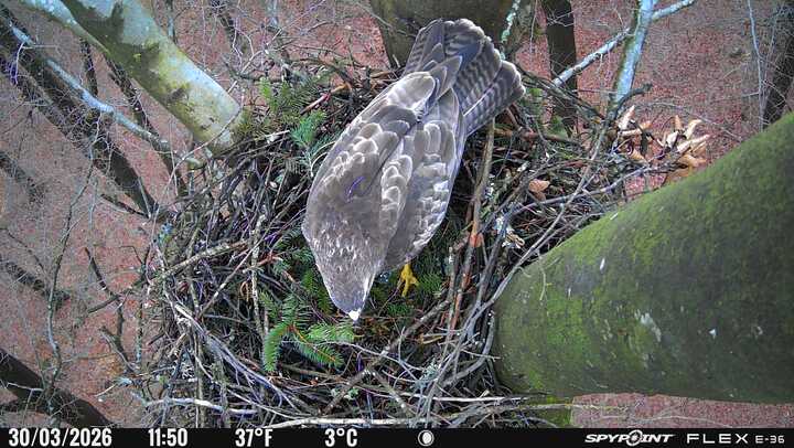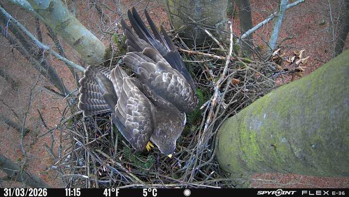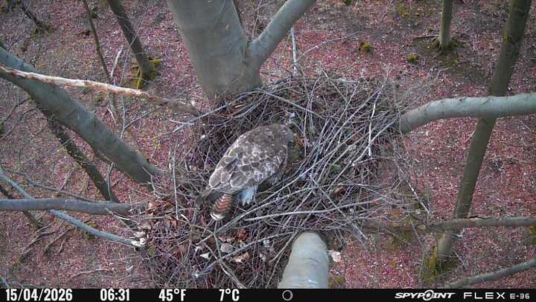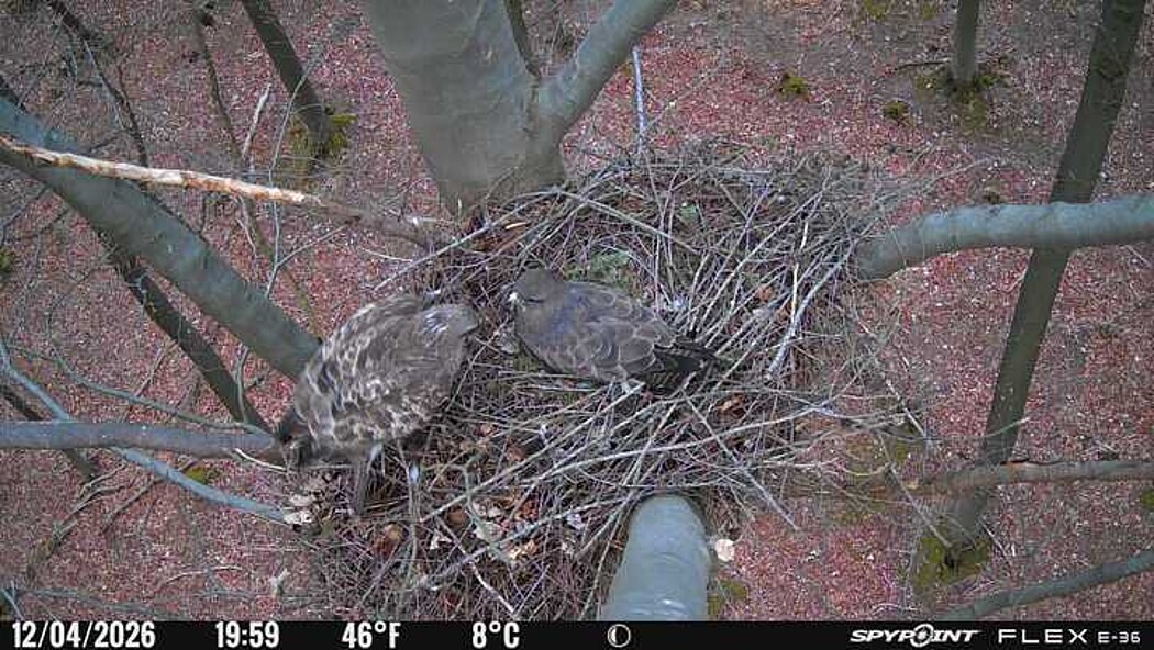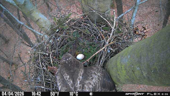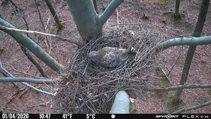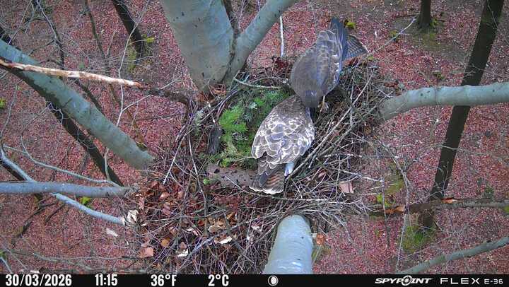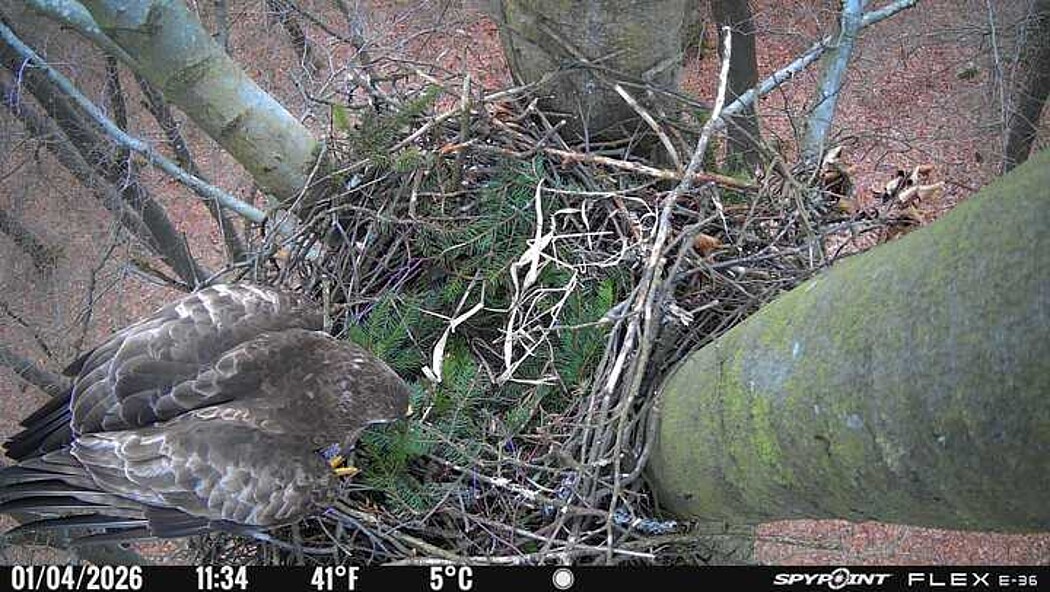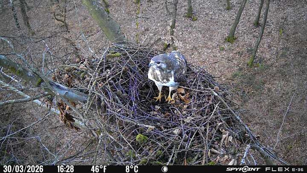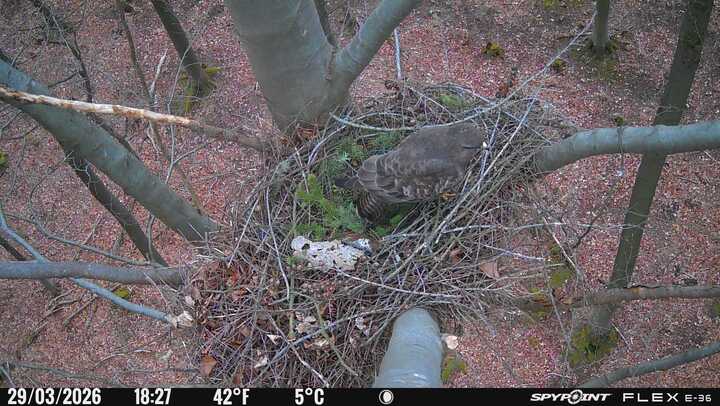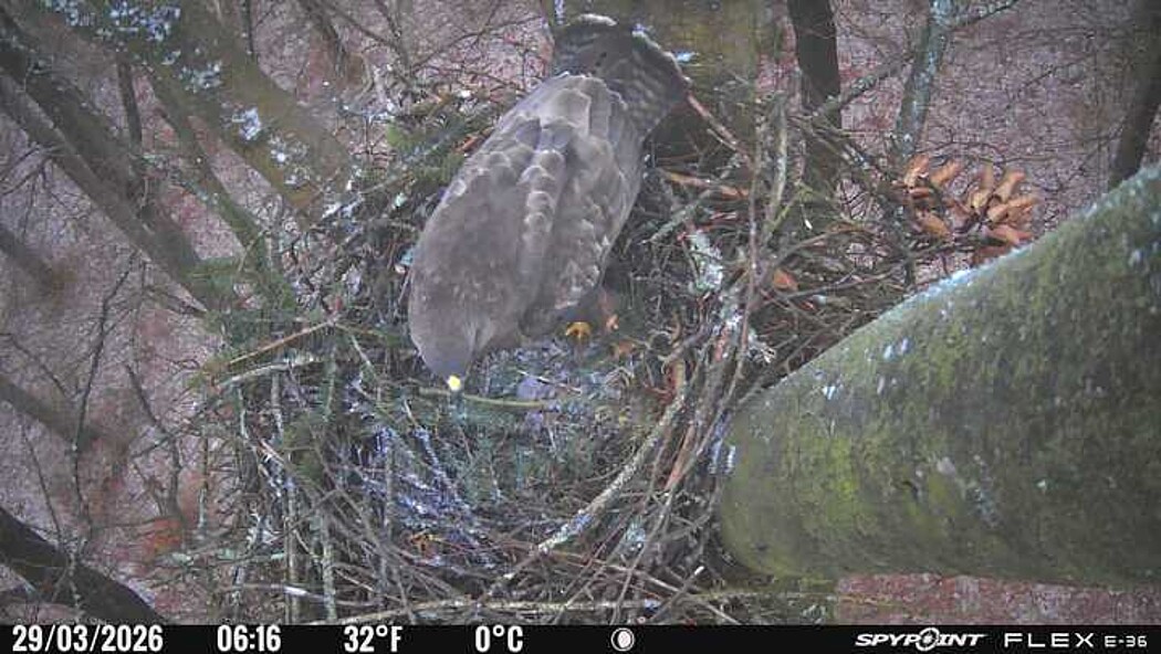 Der massive Horst auf dieser Rotbuche weist einen Durchmesser von mehr als 100 cm auf. Über Wochen richteten sich die Bussarde ihren Brutplatz fleißig ein, doch dann kamen die Waldkäuze. Die eigentlichen Höhlenbrüter übernehmen seitdem den Horst und haben am 16.03.26 ihr erstes Ei gelegt und zwei weitere folgten. Leider wurde die Brut am 25.03. aufgegeben. Warhrscheinlich kam es zu einen Prädationsereignis indem die Eier gefressen wurden.