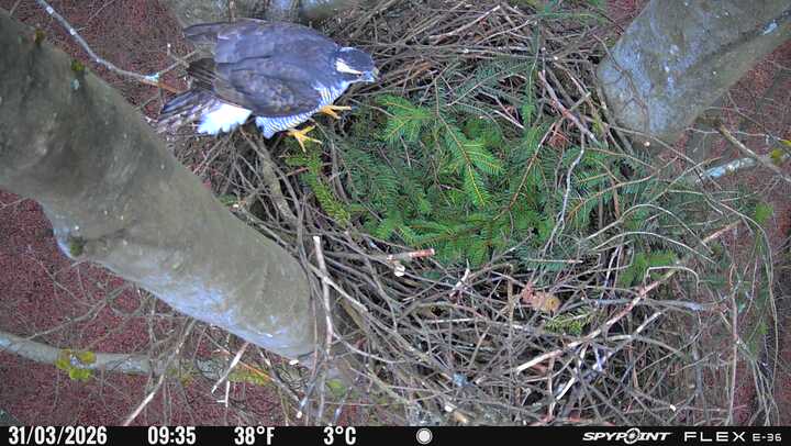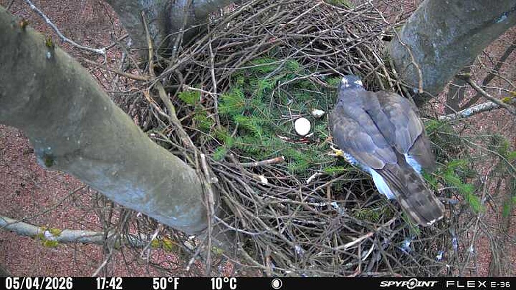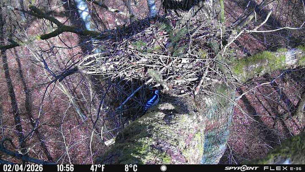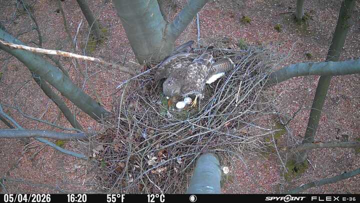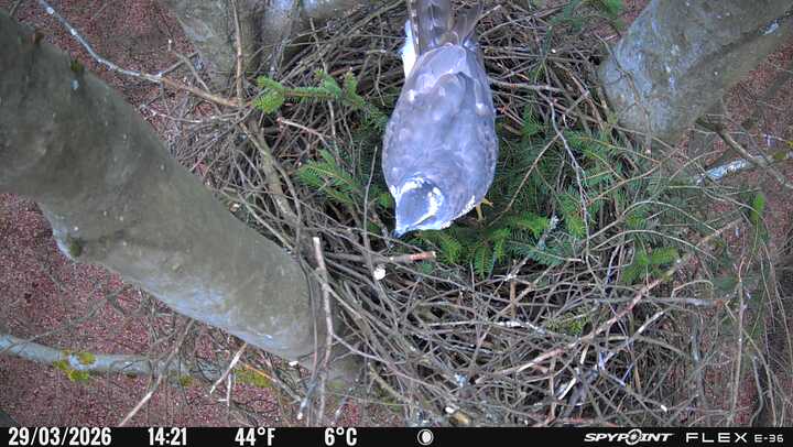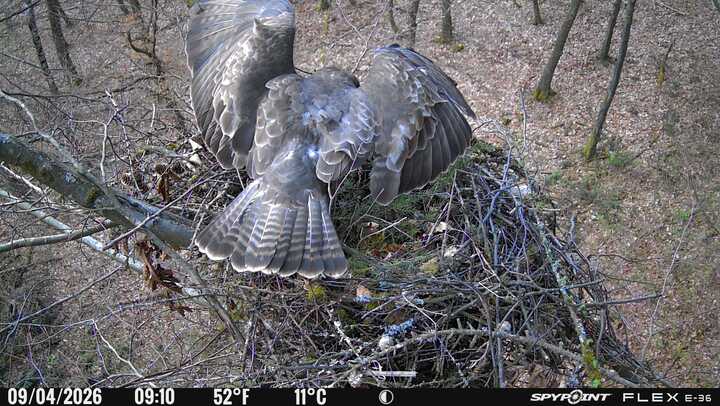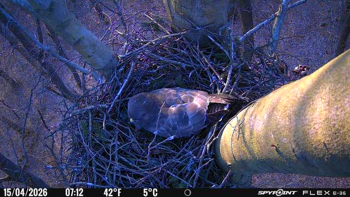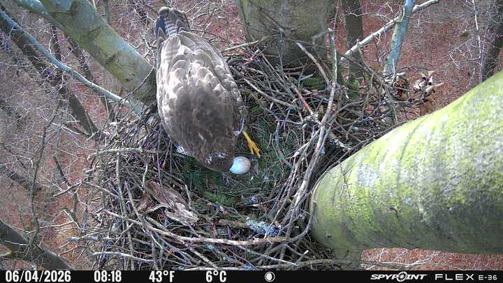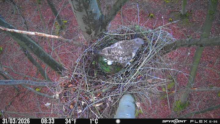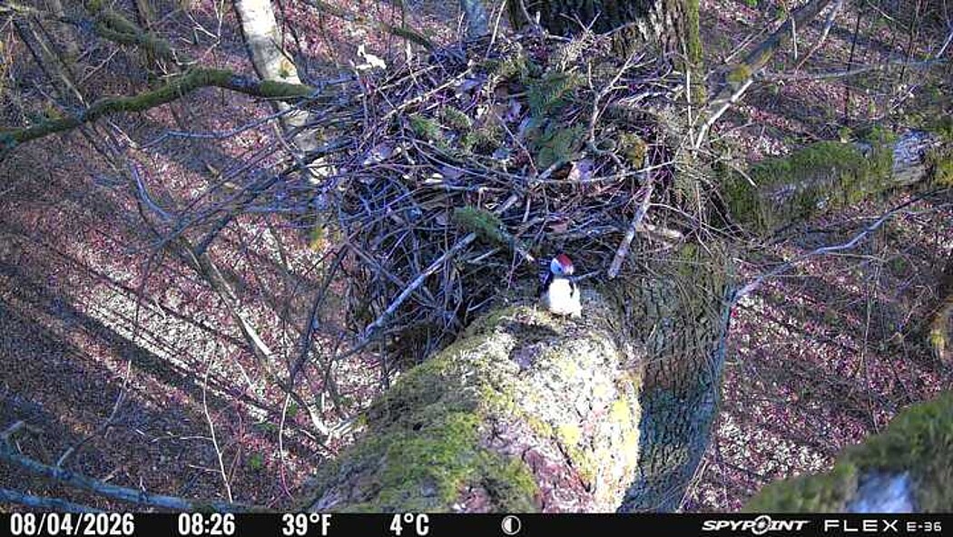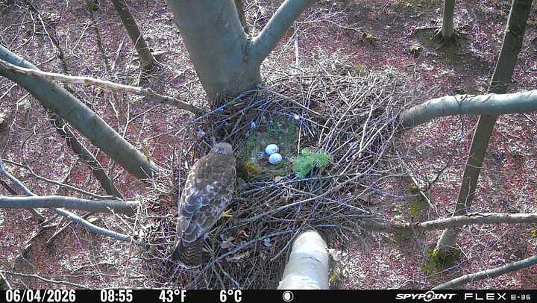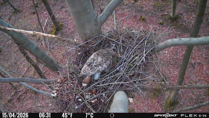 Der massive Horst auf dieser Rotbuche weist einen Durchmesser von mehr als 100 cm auf. Über Wochen richteten sich die Bussarde ihren Brutplatz fleißig ein, doch dann kamen die Waldkäuze. Die eigentlichen Höhlenbrüter übernehmen seitdem den Horst und haben am 16.03.26 ihr erstes Ei gelegt und zwei weitere folgten. Leider wurde die Brut am 25.03. aufgegeben. Warhrscheinlich kam es zu einen Prädationsereignis indem die Eier gefressen wurden.