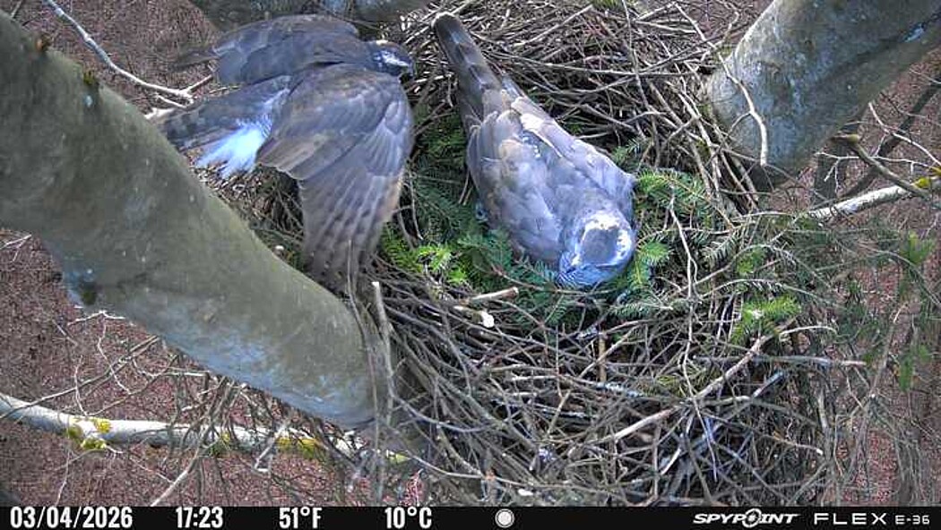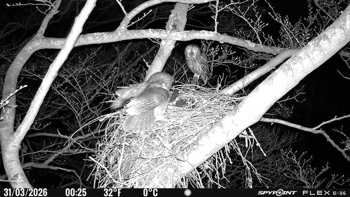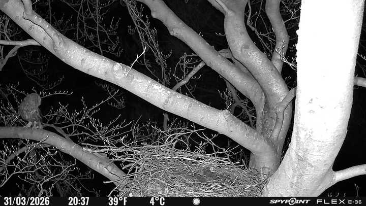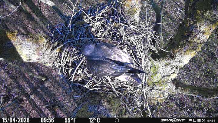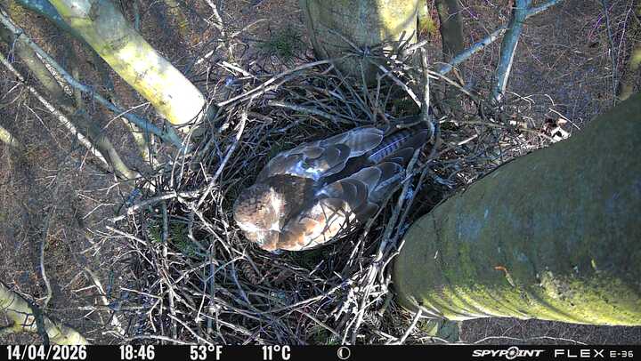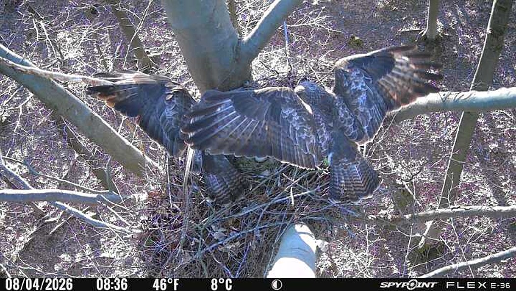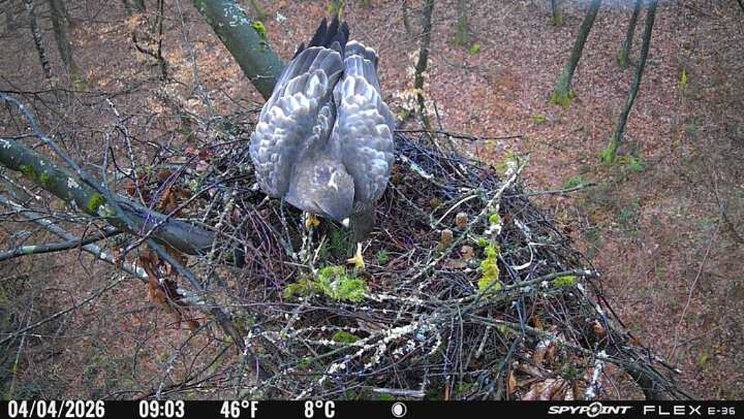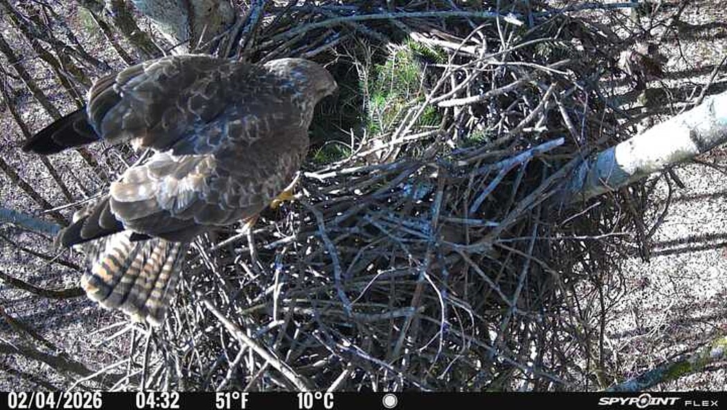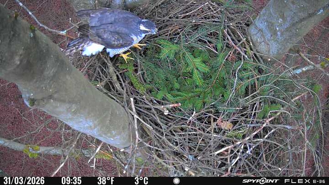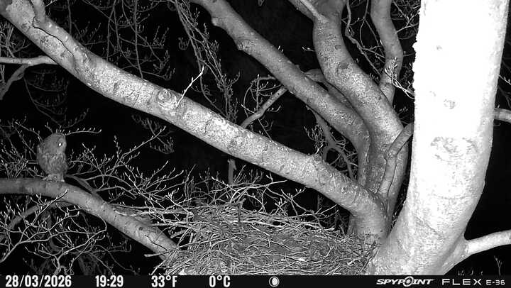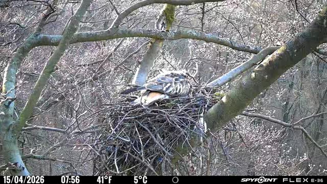 Der massive Horst auf dieser Rotbuche weist einen Durchmesser von mehr als 100 cm auf. Über Wochen richteten sich die Bussarde ihren Brutplatz fleißig ein, doch dann kamen die Waldkäuze. Die eigentlichen Höhlenbrüter übernehmen seitdem den Horst und haben am 16.03.26 ihr erstes Ei gelegt und zwei weitere folgten. Leider wurde die Brut am 25.03. aufgegeben. Warhrscheinlich kam es zu einen Prädationsereignis indem die Eier gefressen wurden.
