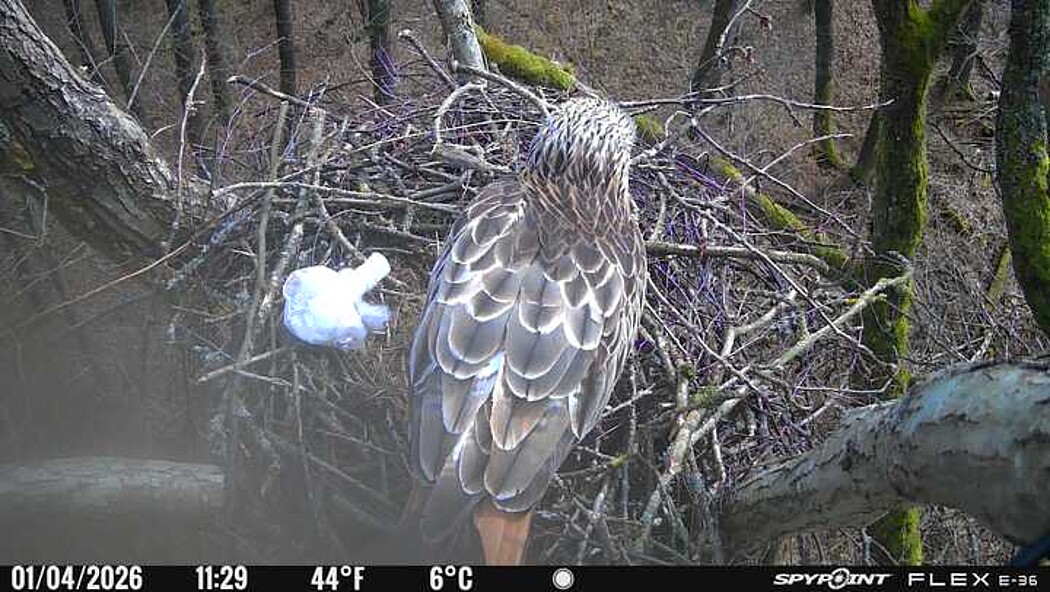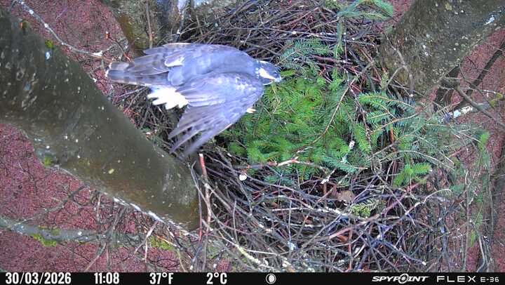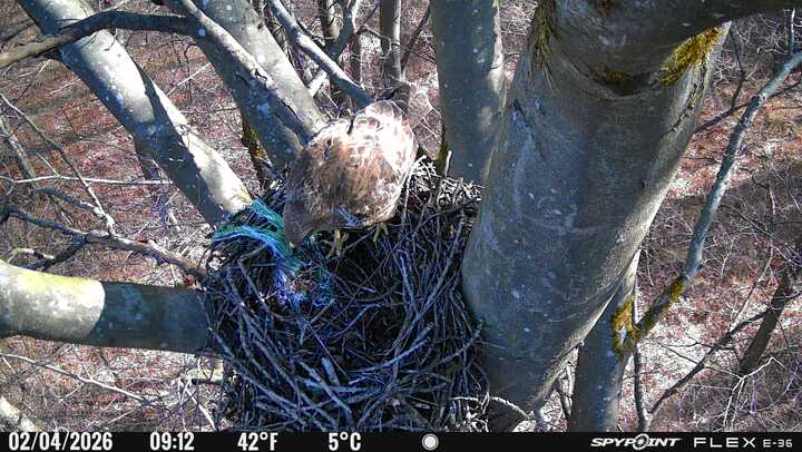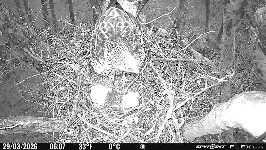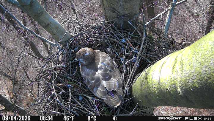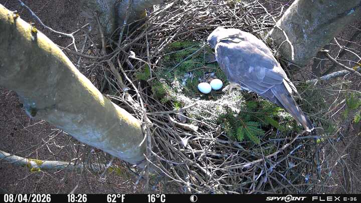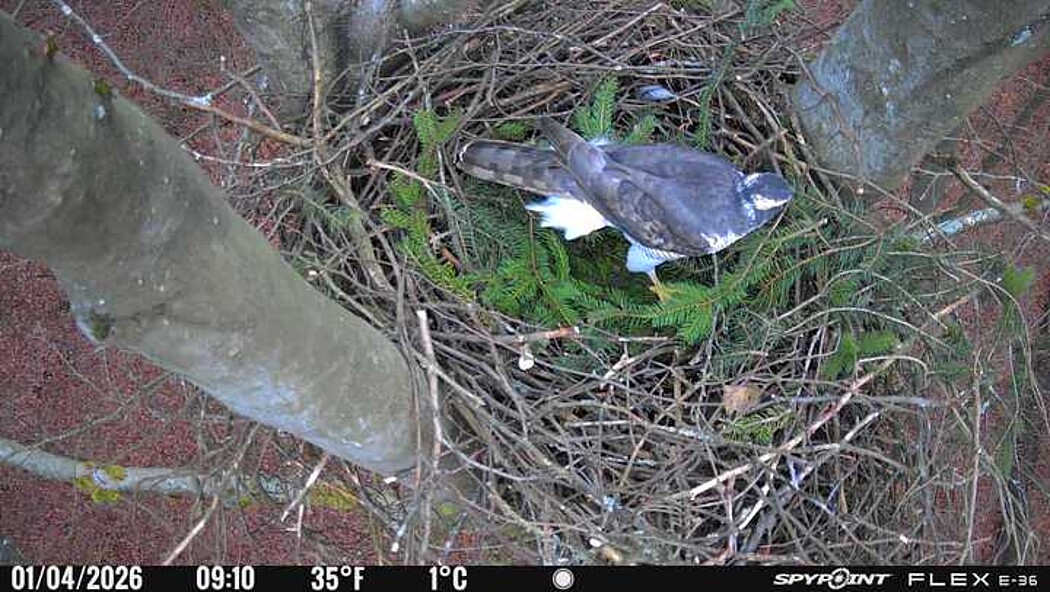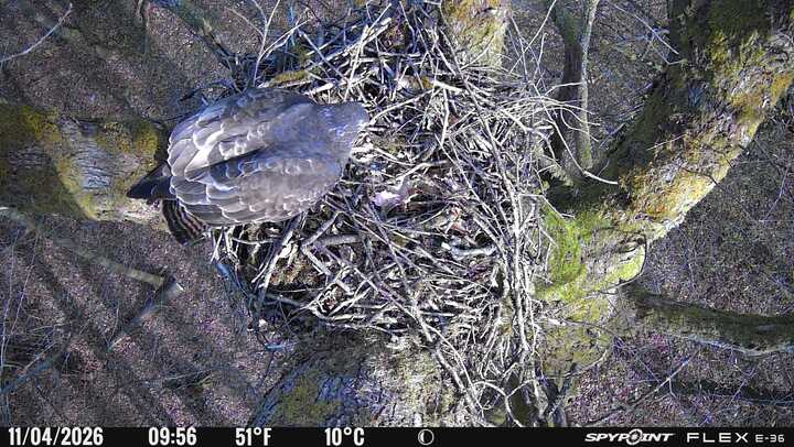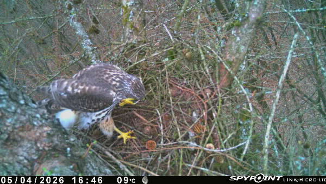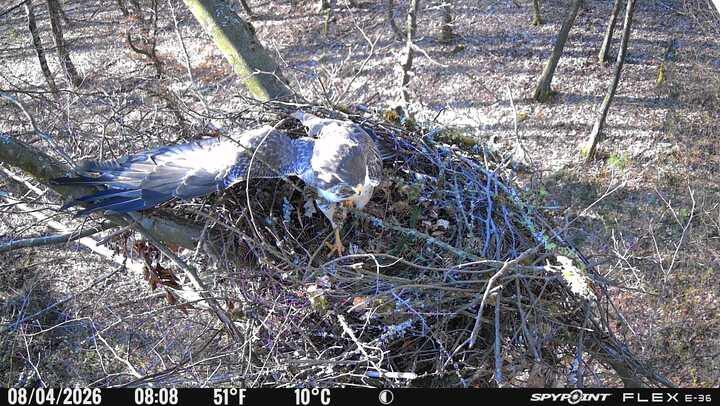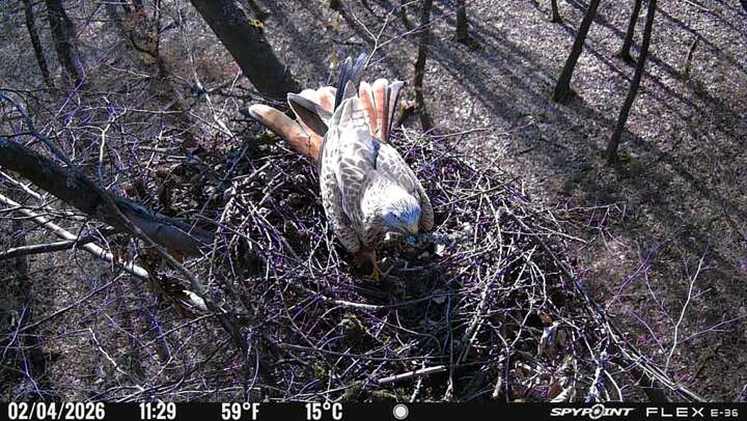 Der massive Horst auf dieser Rotbuche weist einen Durchmesser von mehr als 100 cm auf. Über Wochen richteten sich die Bussarde ihren Brutplatz fleißig ein, doch dann kamen die Waldkäuze. Die eigentlichen Höhlenbrüter übernehmen seitdem den Horst und haben am 16.03.26 ihr erstes Ei gelegt und zwei weitere folgten. Leider wurde die Brut am 25.03. aufgegeben. Warhrscheinlich kam es zu einen Prädationsereignis indem die Eier gefressen wurden.