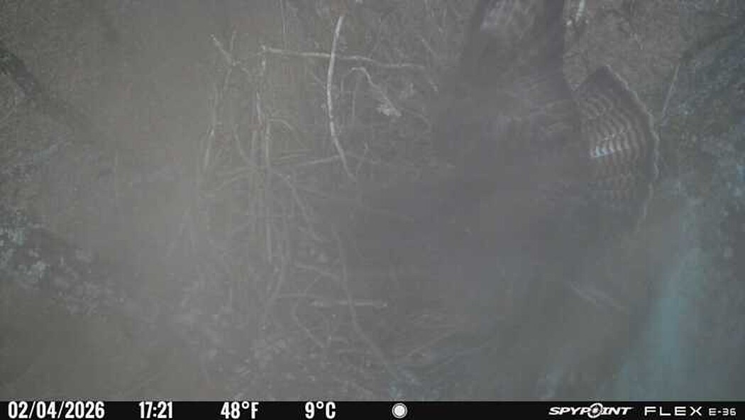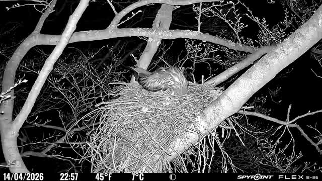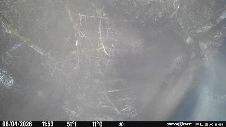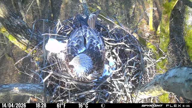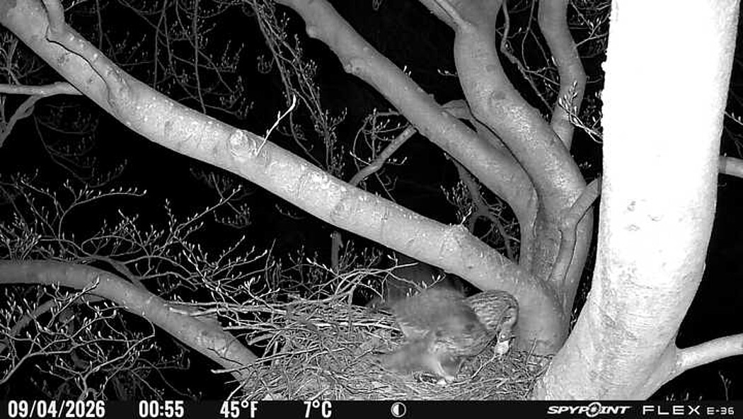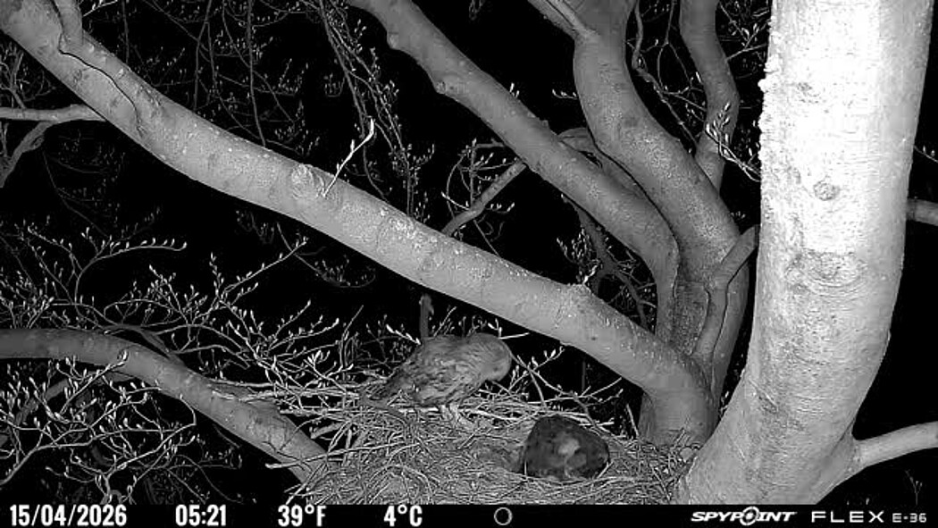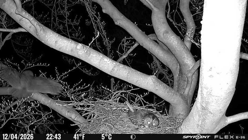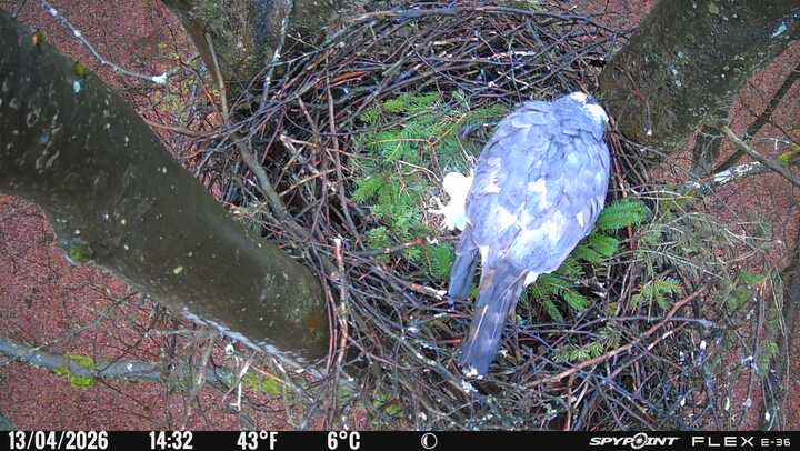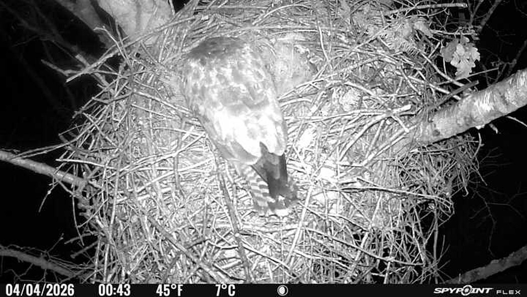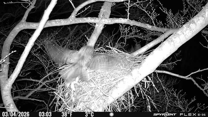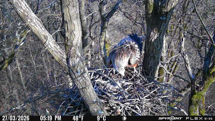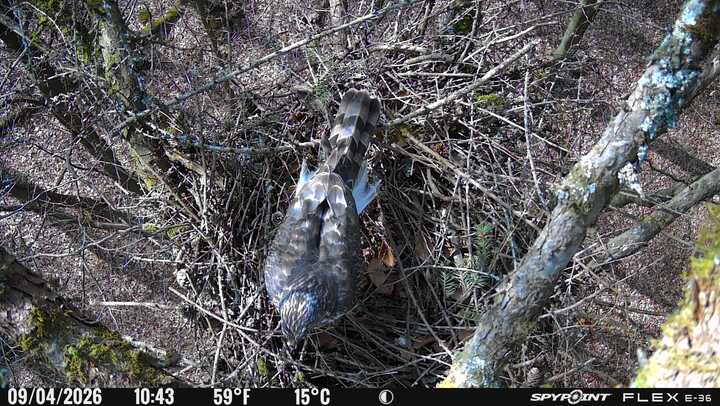 Der massive Horst auf dieser Rotbuche weist einen Durchmesser von mehr als 100 cm auf. Über Wochen richteten sich die Bussarde ihren Brutplatz fleißig ein, doch dann kamen die Waldkäuze. Die eigentlichen Höhlenbrüter übernehmen seitdem den Horst und haben am 16.03.26 ihr erstes Ei gelegt und zwei weitere folgten. Leider wurde die Brut am 25.03. aufgegeben. Warhrscheinlich kam es zu einen Prädationsereignis indem die Eier gefressen wurden.
