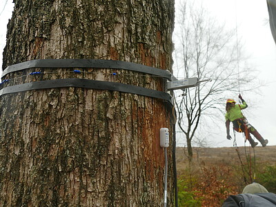 Um die sonst verborgenen Prozesse in der Natur einem breiteren Publikum zugänglich zu machen, habe wir neben Horst- und Höhlenkameras nun auch Sensoren an Bäumen angebracht. Zusammen mit dem Projekt "Natur digital begreifen" wurden am 20. und 21.3. die Sensoren für die sogenannten "Twittering Trees" installiert. Die an den Bäumen angebrachte Sensorik ermöglicht es, in Echtzeit und mit hoher Genauigkeit die Reaktion von Bäumen auf verschiedene Parameter wie Hitze oder Trockenheit zu messen und online darzustellen. Dazu wurde jeder Baum mit einem Saftflusssonsor ausgesattet, welcher ermittelt wie viel Wasser ein Baum im Laufe des Tages verbraucht oder ob er im Sommer sogar unter Trockenstress leidet. Zusätzlich wurde ein sogenanntes Dendrometer (Messgerät zur Umfangsmessung) angebracht. Mithilfe von Millimetergenauen Messungen kann so gezeigt werden, dass der Stammdurchmesser eines Baumes im Laufe eines Tages variieren kann. Morgens ist dieser meist größer als abends, da der Baum im Laufe des Tages Wasser durch Transpiration verliert. Alle Daten werden über eine Logger gespeichert und auf einen Server übertragen. In Kürze können Sie die Daten auf unserem Server einsehen.