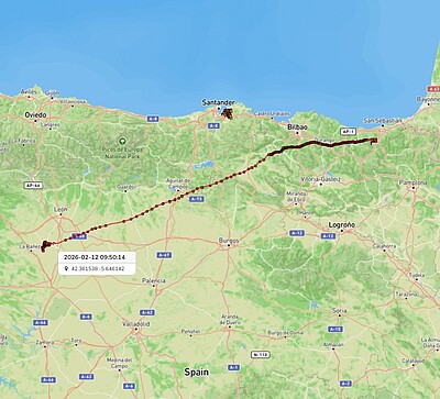Seit gestern Morgen (12. Februar 2026) ist der erste männliche besenderte Rotmilan wieder auf dem Weg zurück nach Deutschland. Die weiteren fünf Rotmilane befinden sich seit Dezember noch an denselben Standorten in Spanien.