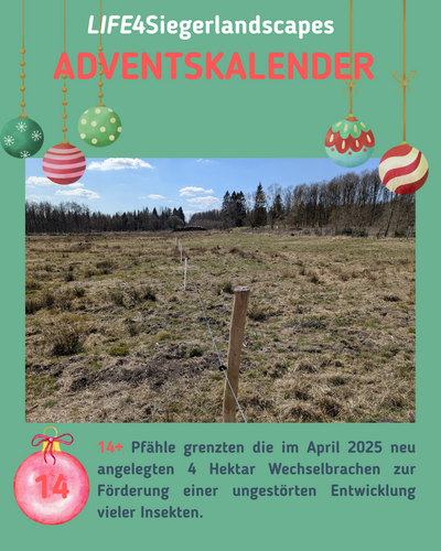 🎁 Tür 14: 14+ Pfähle grenzten die im April 2025 neu angelegten 4 Hektar Wechselbrachen zur Förderung einer ungestörten Entwicklung vieler Insekten. 🐝🪲