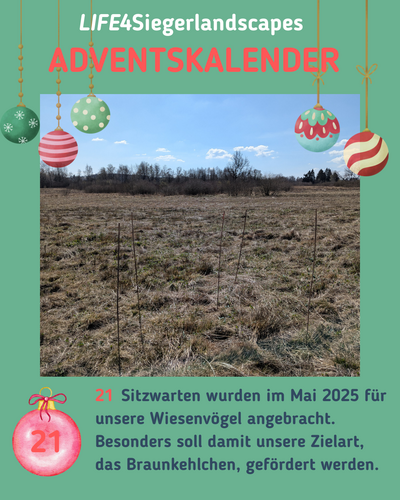 🎁 Tür 21: 21 Sitzwarten wurden im Mai 2025 für unsere Wiesenvögel 🐦 angebracht. Besonders soll damit unsere Zielart, das Braunkehlchen 🐤, gefördert werden.