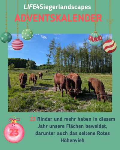 🎁 Tür 23: 23 Rinder und mehr haben in diesem Jahr unsere Flächen beweidet, darunter auch das seltene Rotes Höhenvieh 🐂.