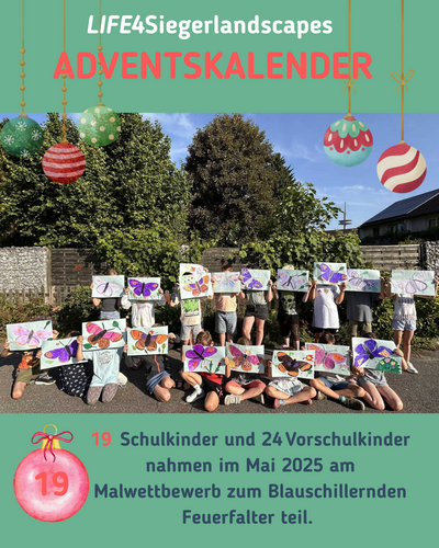 🎁 Tür 19: 19 Schulkinder und 24 Vorschulkinder nahmen im Mai 2025 am Malwettbewerb zum Blauschillernden Feuerfalter 🦋 teil. 🎨