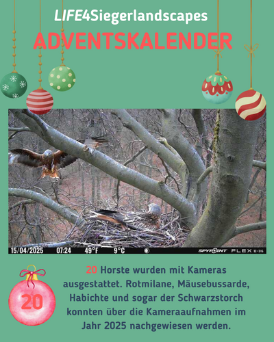 🎁 Tür 20: 20 Horste wurden mit Kameras 📷 ausgestattet. Rotmilane 🦅, Mäusebussarde, Habichte und sogar der Schwarzstorch konnten über die Kameraaufnahmen im Jahr 2025 nachgewiesen werden.