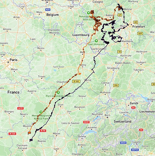 WB-1 befindet sich hinter Mainz und fliegt in Richtung Südwesten. Nach einer 2,5-wöchigen Pause südlich des Naturparks Soonwald-Nahe ist es seit dem 6. August wieder unterwegs, nun jedoch in Flugrichtung Südosten.