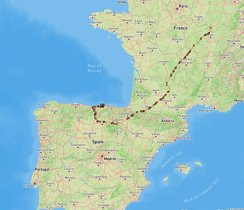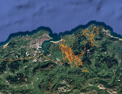 Am 8. Oktober überquerte es die spanisch-französische Grenze und flog zunächst südlich an Pamplona und Logroño vorbei, bevor es die Atlantikküste erreichte. Seit dem 12. Oktober hält es sich östlich von Santander, nahe am Meer, in einer landwirtschaftlich geprägten Region auf und unternimmt Ausflüge in einem Umkreis von etwa 5 Kilometern.
