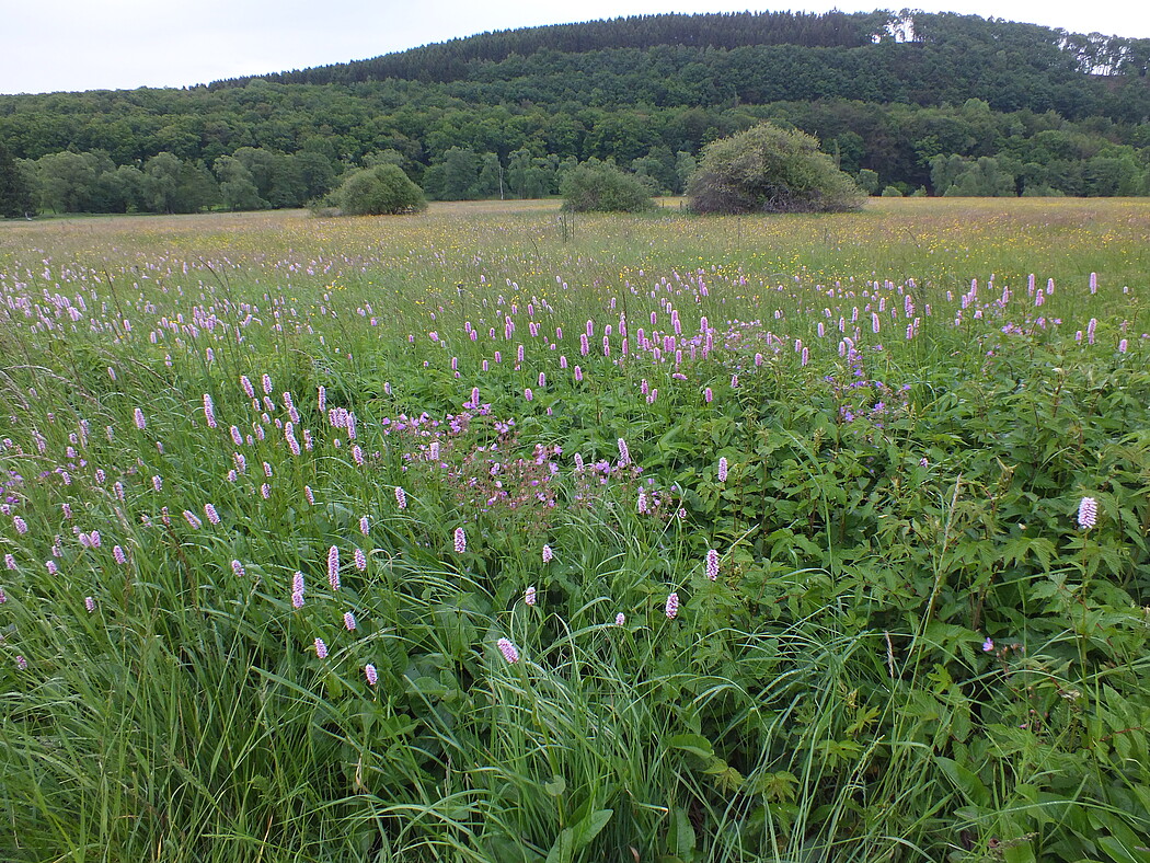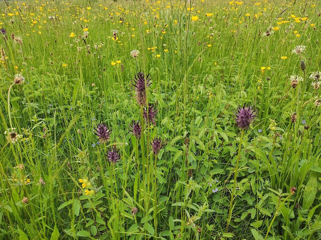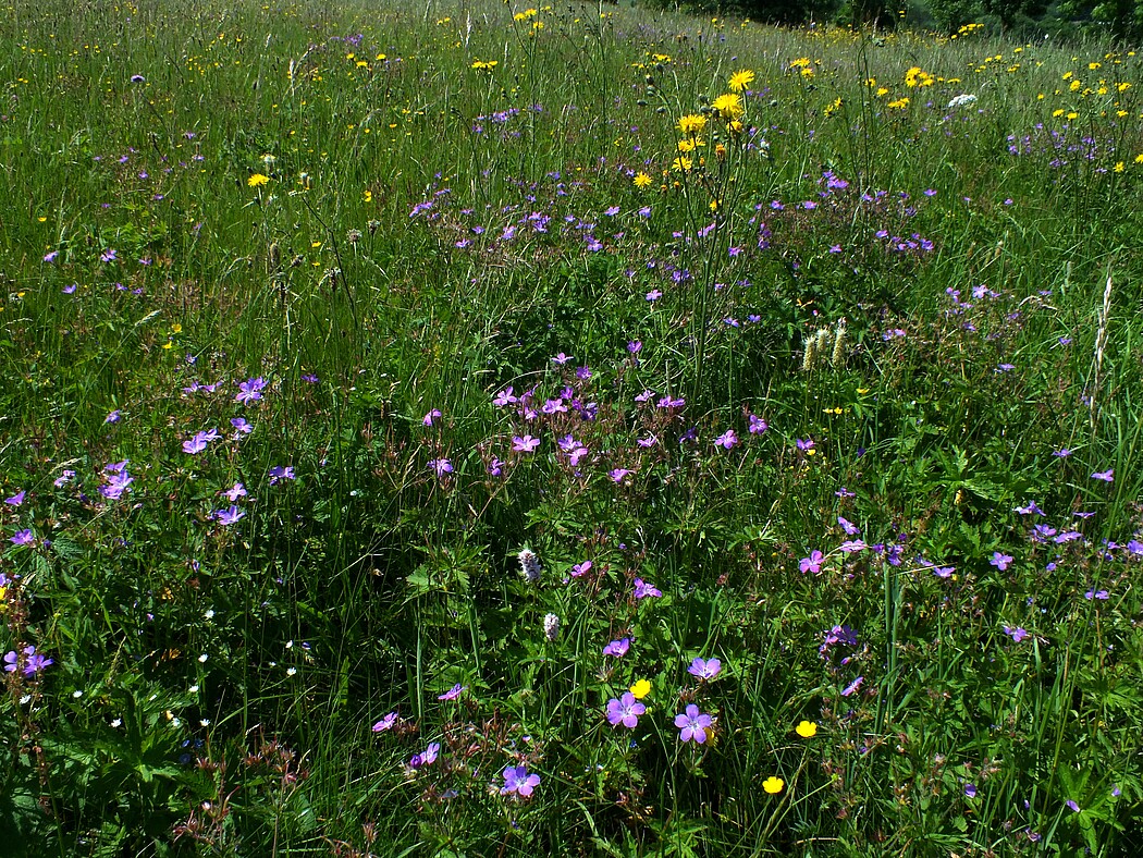 Bergmähwiesen gehören zu den europaweit schützenswerten Lebensräumen, für die wir als Gemeinschaft eine besondere Verantwortung haben. Auf einer Untersuchungsfläche von 5x5 m Bergmähwiese kommen meist zwischen 40 und 60 verschiedene Pflanzenarten vor - viele davon mit bunten und auffälligen Blüten! Diese Wiesen befinden sich typischerweise in mittleren bis höheren Lagen der Mittelgebirge und Alpen und sind durch eine extensive Bewirtschaftung geprägt. Die traditionelle Mahd, die vorwiegend ein- bis zweimal jährlich erfolgt, verhindert die Verbuschung und fördert eine vielfältige Flora und Fauna. Charakteristisch für die Bergmähwiesen sind zahlreiche Pflanzenarten, darunter viele seltene und gefährdete Arten wie die Arnika (Arnica montana) und die Trollblume (Trollius europaeus). Zudem bieten sie einen wichtigen Lebensraum für verschiedene Insekten sowie für bodenbrütende Vogelarten wie das Braunkehlchen (Saxicola rubetra) und den Wiesenpieper (Anthus pratensis).